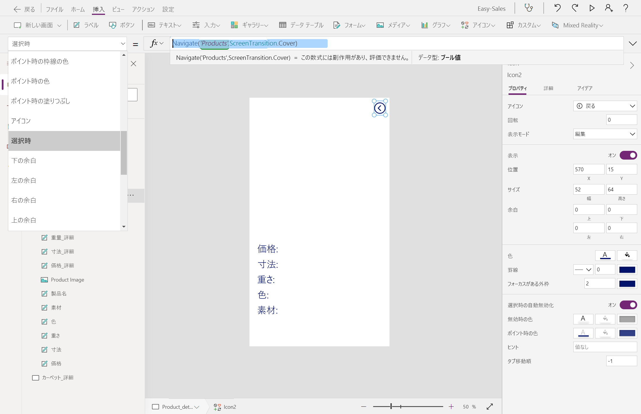 前の画面に移動する 戻る アイコンを追加します。 [戻る] アイコンを追加するには、[アイコン] ドロップダウンを展開し、[戻る] アイコンを選択します。 [戻る] アイコンを正しく配置し、次を追加して OnSelect プロパティを構成します。
