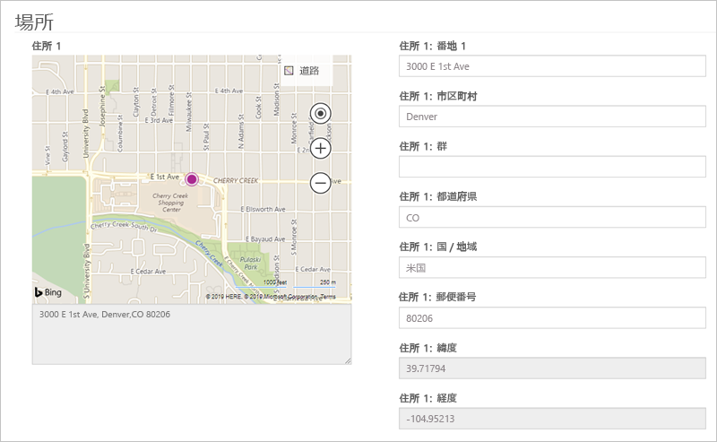 位置情報 - フォームを設定して、既存の場所をマップ上のピンとして表示したり、ユーザーが場所を指定したりできるようにマップ コントロールを表示することができます。 フォームのマップ コントロールでは、さまざまな場所列を特定したり、列に値を割り当てたり、それらの列から値を取得したりするためには、その他の構成が必要になります。 詳細については、「フォームの位置情報の構成」を参照してください。