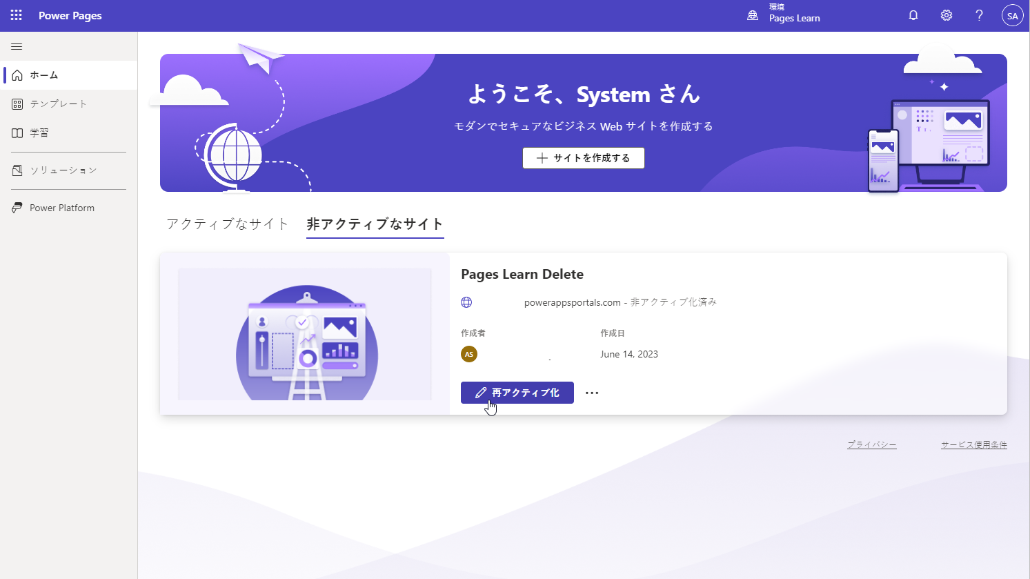 移行した Web サイトをアクティブにするには、移行先の環境の Power Pages ホーム画面で、非アクティブなサイト タブを選択し、移行先の Web サイトに対して再アクティブ化を選択します。メッセージが表示されたら、新しい Web サイト名と新しい Web アドレスを指定します。