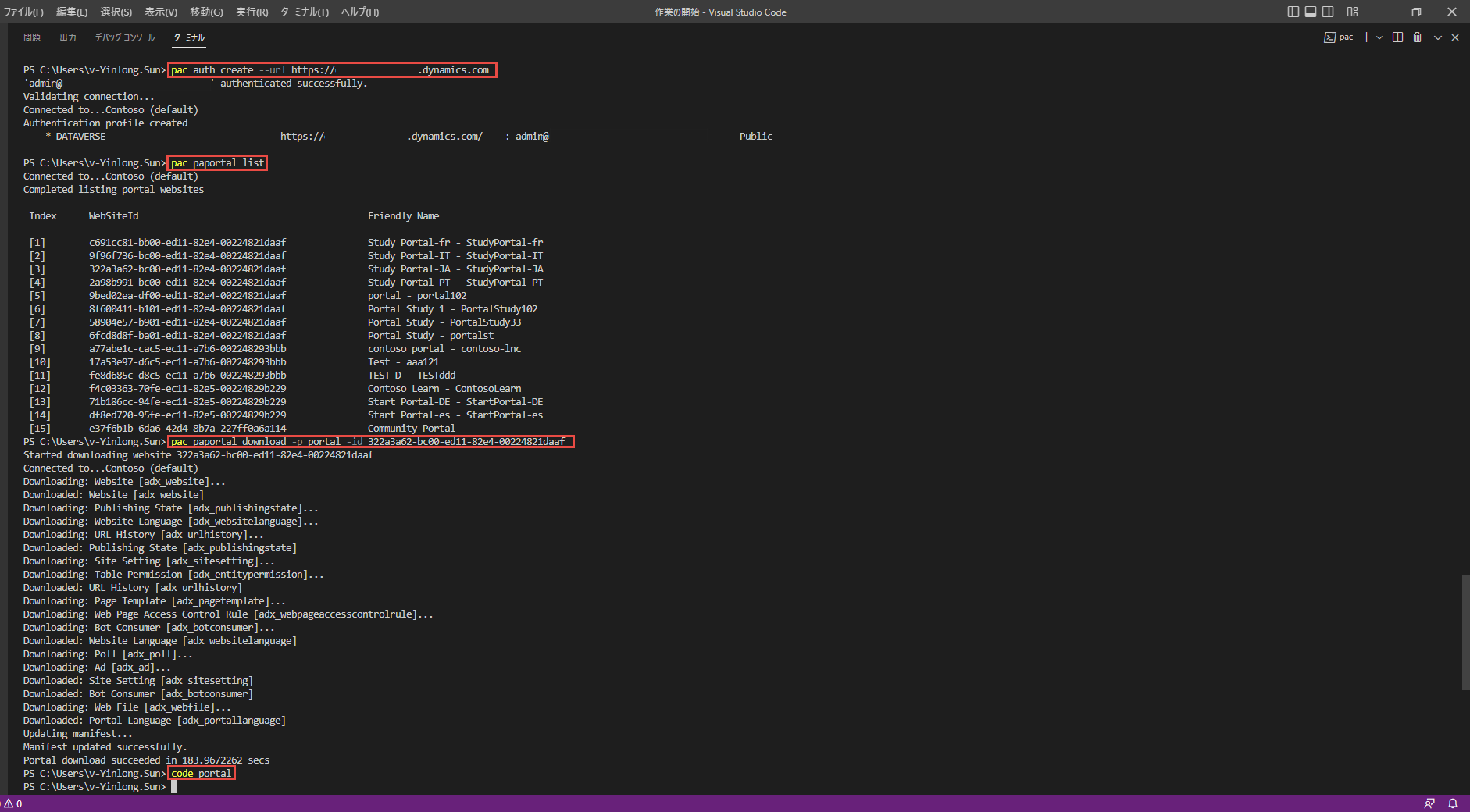 pac paportal download -p portal -id paste-websiteid-here」と入力して、Portal フォルダーへの Web サイト データのダウンロードを開始します。「