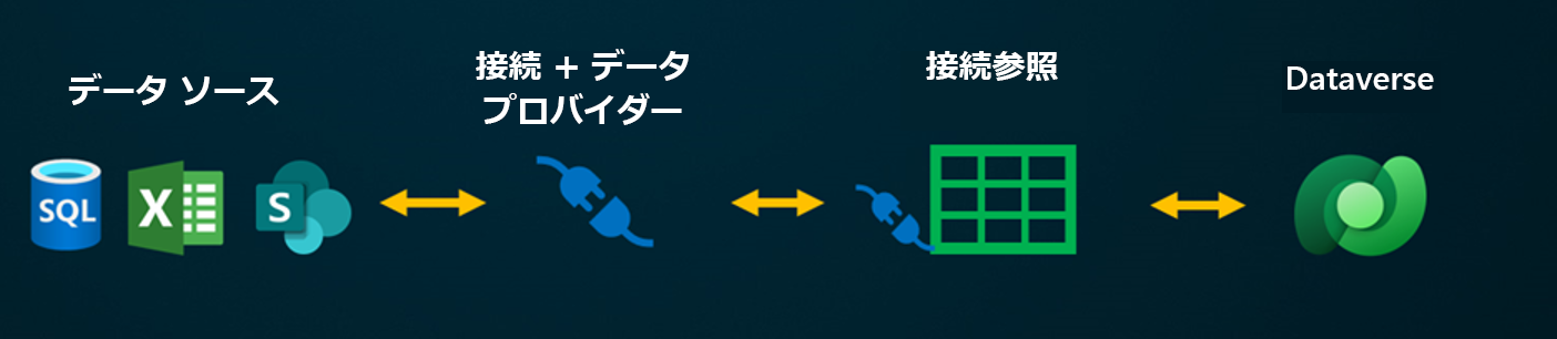 データにアクセスするもう 1 つのオプションは、仮想テーブルを使用することです。 外部データ ソースからデータにアクセスし、そのデータを Dataverse に結合する要件を検討してください。 仮想テーブルを使用すると、Dataverse に仮想テーブルを作成し、外部データ ソースを定義した後、テーブルと列を外部データ ソース にマッピングできます。