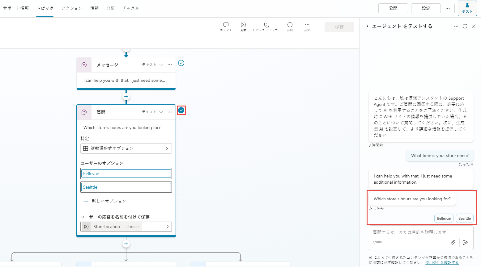 以下の画像では、エージェントに「営業開始時間は何時ですか?」とメッセージを送信しています。 Store Hours のトピックが自動的に表示されることに注目してください。 会話パスは緑色で強調表示されます。 エージェントはいつでも応答できる状態であり、応答方法についての提案ボタンが 2 つ表示されています。 これらの提案ボタンには、トピックが以前に作成されたときに定義された、シアトルおよびベルビューのユーザー オプションが表示されています。 [エージェントのテスト] で、いずれかの提案ボタンを選択することで続行できます。