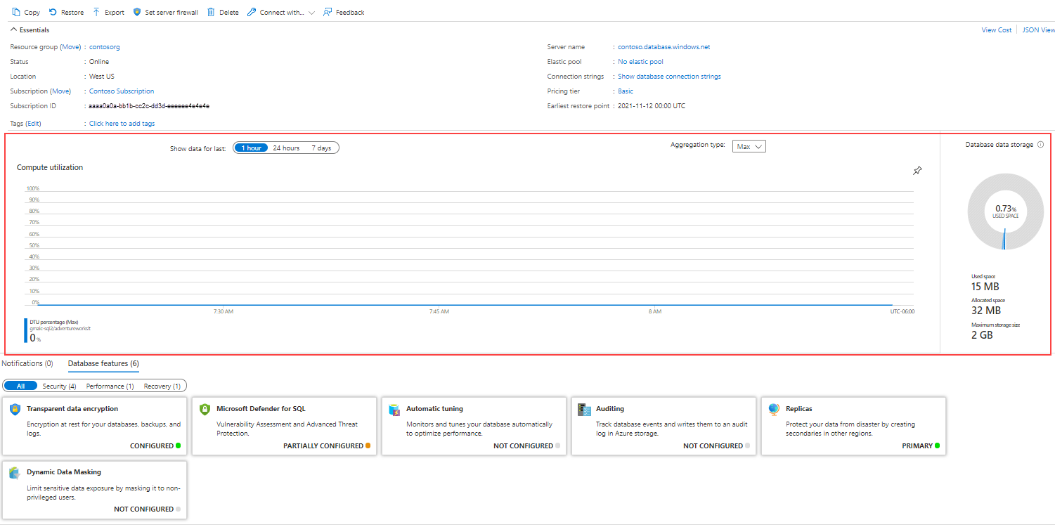 SQL Database properties from Azure portalから SQL Database のプロパティを