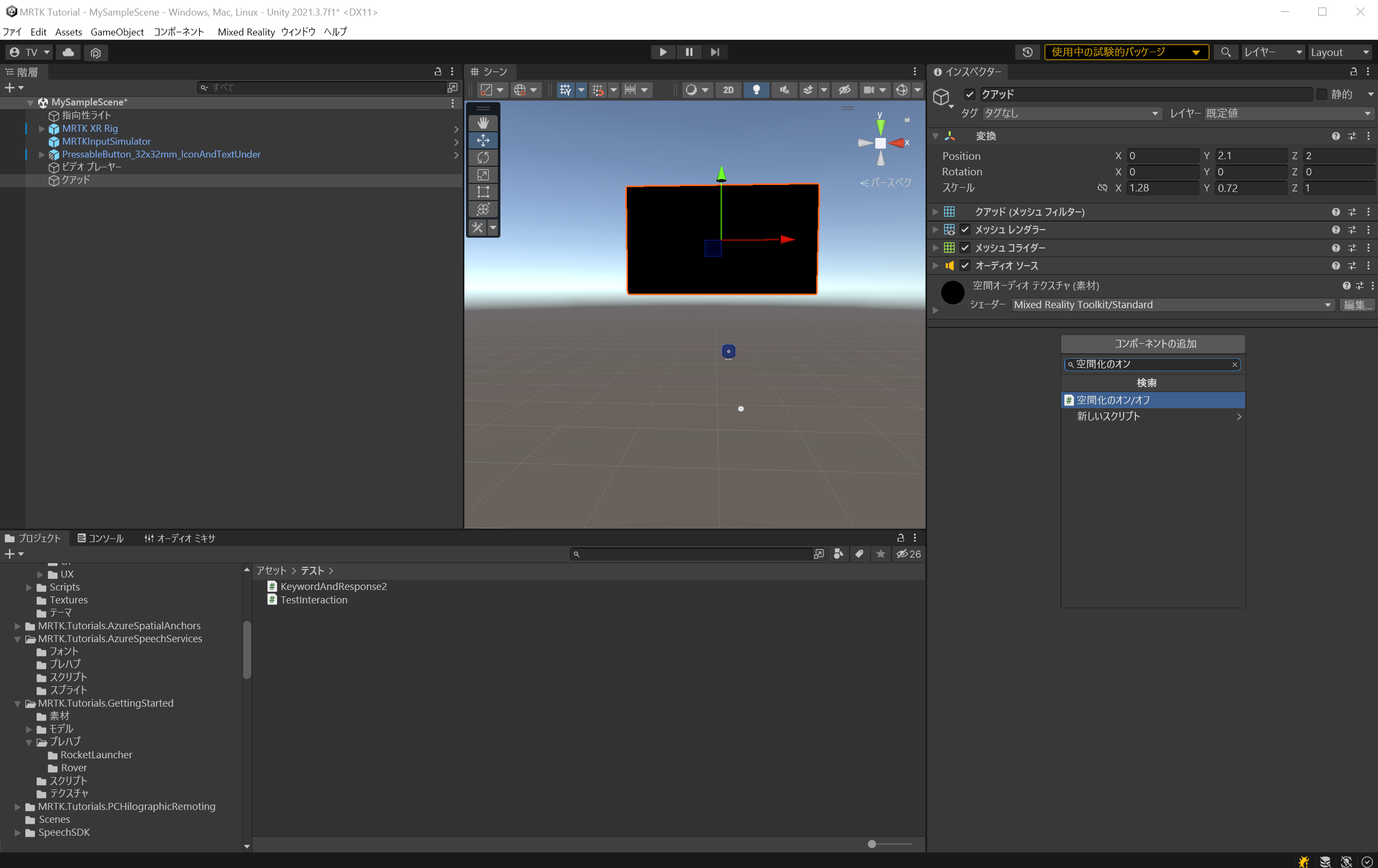 [階層] で [クワッド ] を選択します。 [インスペクター] ウィンドウで、[コンポーネントの追加] ボタンを使用して SpatializeOnOff(Script) を追加します