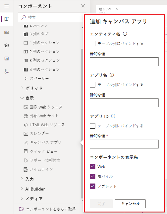 モデル駆動型フォームへのキャンバス アプリの埋め込み