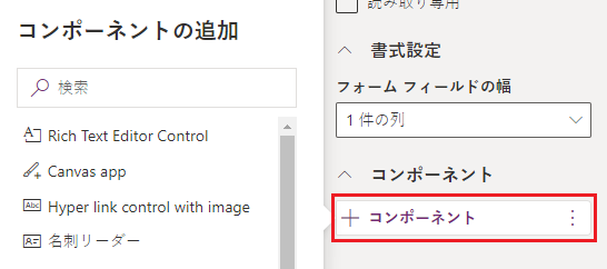 または、キャンバス アプリにバインドする列を選択してから、フォーム エディターの右側にある列プロパティのウィンドウで Component プロパティを選択することもできます。 コンポーネントの追加 ダイアログで、キャンバス アプリを選択します。