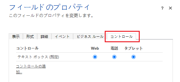 クラシック表示で、キャンバス アプリにバインドする列を選択します。 ホーム タブの編集グループで、プロパティの変更を選択します。フィールド プロパティ ダイアログで、コントロール タブを選択します。
