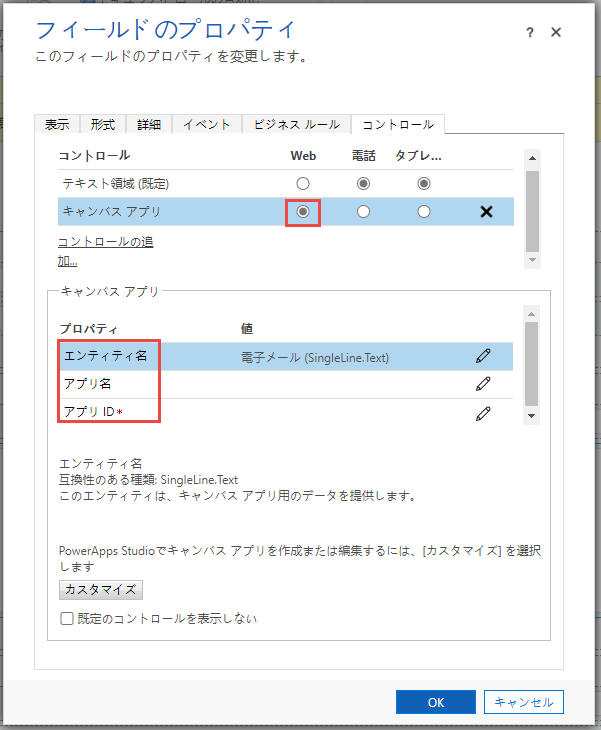 既存のキャンバス アプリがない場合には、アプリ名とアプリ ID のプロパティを空白のままにし、フィールドのプロパティ ダイアログのカスタマイズ ボタンを選択して、新しいキャンバス アプリを作成できます。 このアクションによって、Power Apps のキャンバス アプリ スタジオが開きます。