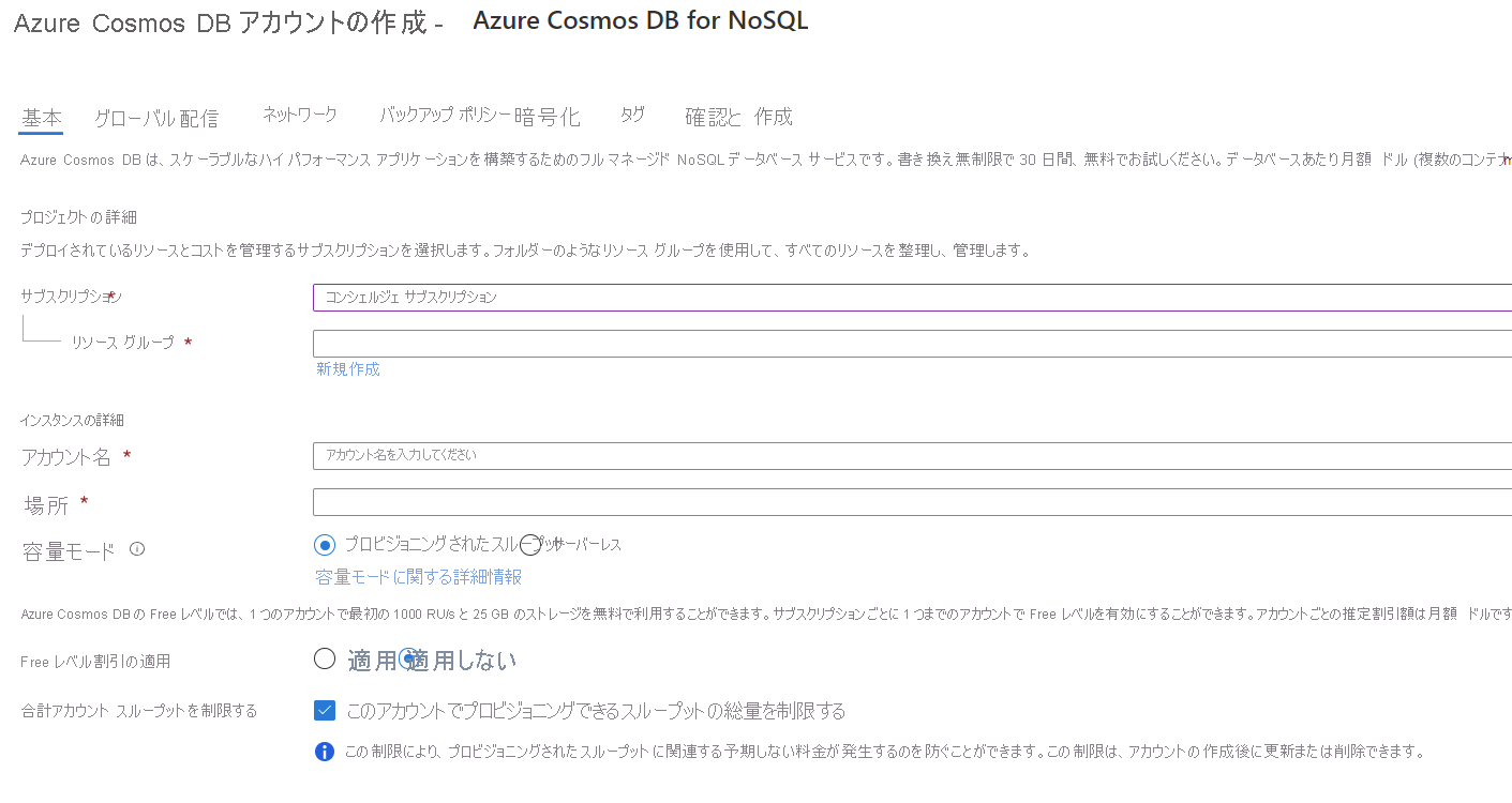 Azure Cosmos DB アカウントを作成するには、[ 基本 ] タブのオプションのみが必要です。