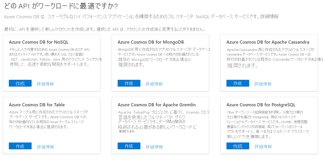 ポータルで新しいアカウントを作成する場合、最初に、ワークロードの API を選択する必要があります。 アカウントを作成した後に、選択した API を変更することはできません。 このセクションの残りの部分では、NoSQL API が選択されていることを前提とします。