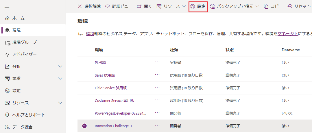 Power Platform 管理センターに移動し、管理を選択して、環境を選択します。 (既に選択されている可能性があります) この演習で使用する環境を選択し、設定を選択します。