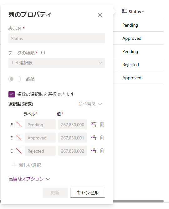 9. Status がテキスト列の場合、ステータスはオプションと入力して選択肢列に変換します。