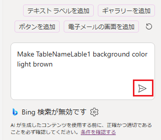 2. Copilot プロンプトに TableNameLabel1 の背景色を薄茶色にすると入力して送信します。