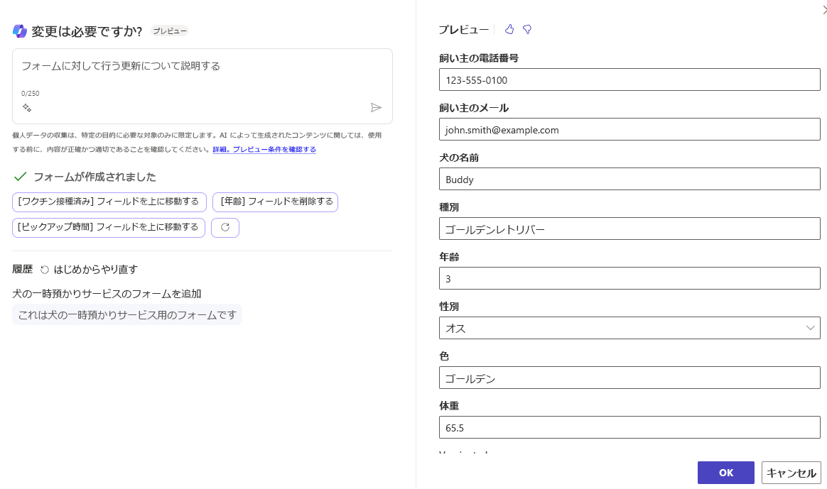 Copilot にフォームの作成を指示する場合、他にもいくつかの考慮事項があります。 Copilot からフォームの入力を求めされたら、できる限り多くの詳細を入力します。 この方法により、最初に使用する、より具体的な下書きフォームが提供されます。 その後、必要なフォームを作成する準備が整うまでプロンプトを続行できます。 フォームは、必要に応じて単一ステップまたは複数ステップにできます。