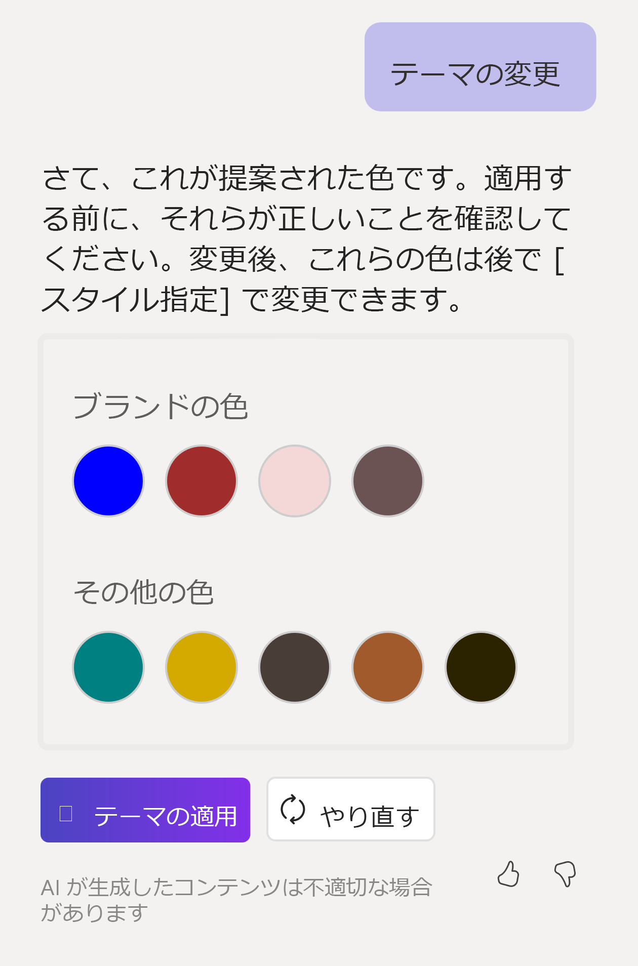 Copilot にテーマの変更を指示すると、Copilot ダイアログに色のオプションが表示されます。 その後、Copilot に適用して欲しい色を選択できます。 別の色のテーマを試す場合は、最終的な選択を行う前に、さらに多くのオプションを表示して複数の色を試すことを、Copilot に引き続き指示できます。