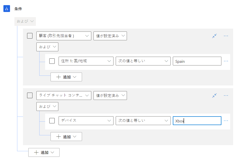 柔軟性を持たせるため、単一の添付ルールで複数の条件を定義できます。 また、AND/OR 条件を使用をまとめてグループ項目に対して使用することで、柔軟性を高めることができます。 この手法は、特定の製品タイプの操作などのスキル習熟度が複数の要素に影響を受ける場合に役立ちます。 たとえば、顧客が Xbox 360 に関連する会話を開始し、アカウントに関する質問をした場合、この問題の処理には高い習熟度が必要でない場合があります。 また、技術サポートに関する問い合わせでは、高い習熟度が必要な場合があります。