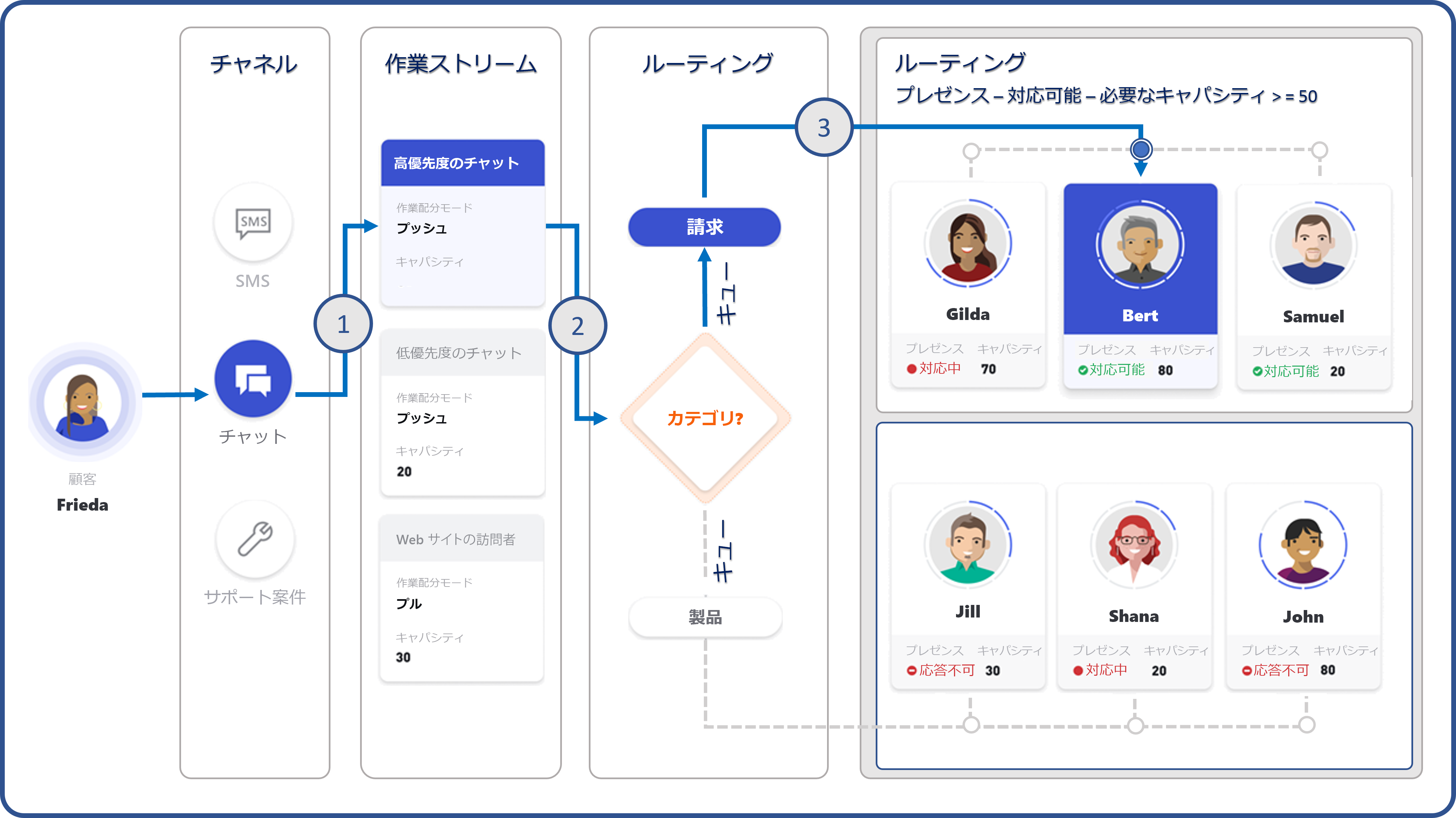 先ほどの図は、以下のようにスキル ベース ルーティング プロセスを示しています。