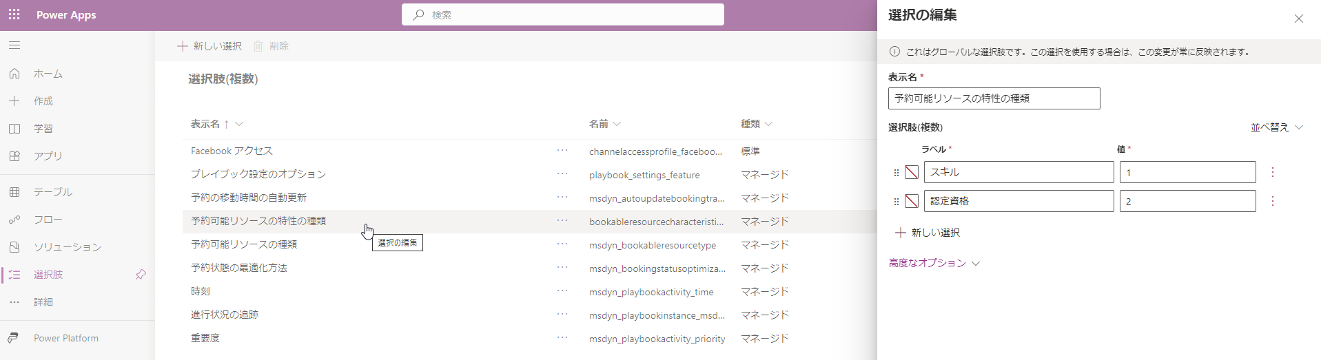 スキル タイプを定義するには、Microsoft Power Apps Maker Portal で予約可能リソースの特性の種類オプション セットを使用します。 この機能は Customer Service 用オムニチャネルに特有なものではないため、これらのタイプを定義するには、Customer Service 用オムニチャネルが展開された環境で管理者権限を持つ人物として、https://make.powerapps.com にサインインする必要があります。 サイト マップのナビゲーションで、データを展開し、選択肢を選択します。 予約可能リソースの特性の種類オプション セットを見つけて開きます。