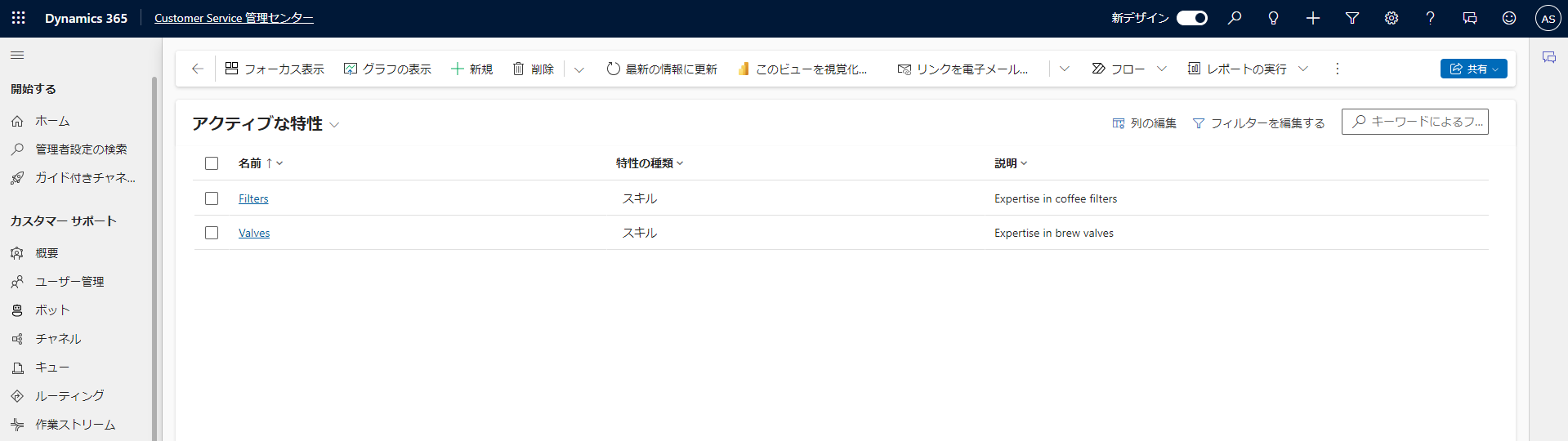 必要なスキルのタイプを定義したら、担当者および受信した会話用に定義される具体的なスキルを作成できます。 スキルのタイプとは異なり、スキルは Customer Service 管理センター アプリで定義され、ユーザー管理 セクションの スキル を選択することでアクセスできます。