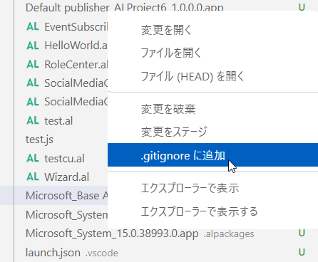 ソース管理エクスプローラーでファイルを右クリックし、.gitignore に追加を選択できます。