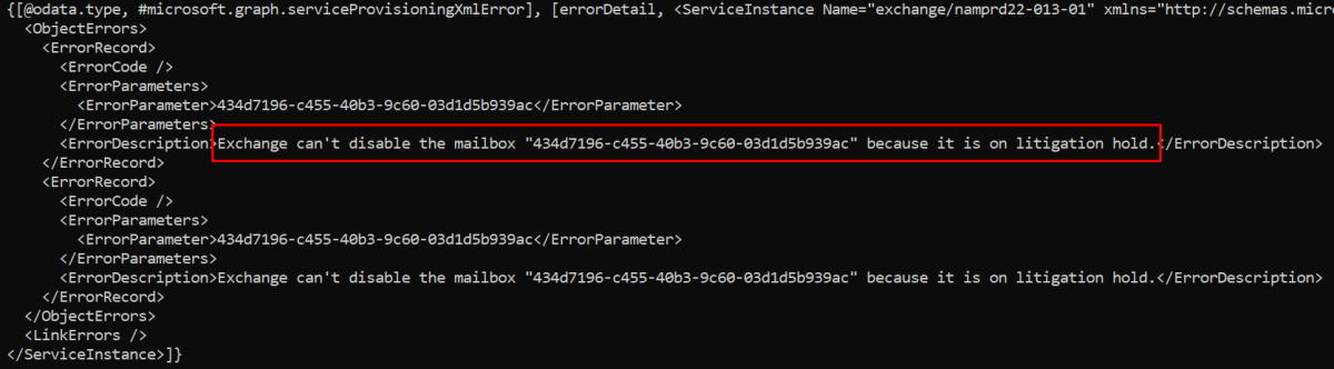Get-MgBetaUser -All | Select-Object -Property UserPrincipalName -ExpandProperty ServiceProvisioningErrors | FL UserPrincipalName, AdditionalPropertiesリストされている各ユーザーの AdditionalProperties パラメーターの ErrorDescription 値を確認します。 次の例では、エラーの説明は、Exchange Online が訴訟ホールドを持つメールボックスを無効にできないことを確認します。