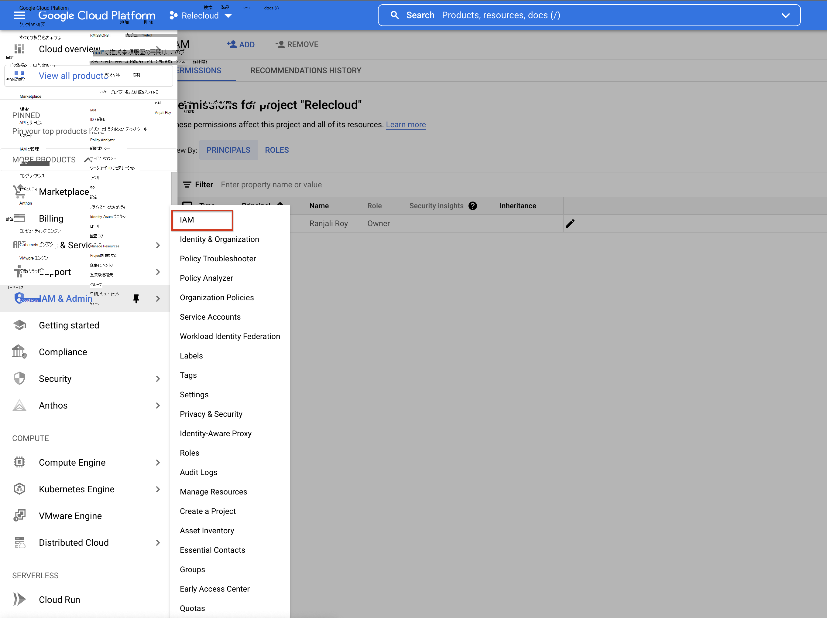 画面の左上隅にある [ハンバーガー] メニューに移動し、[IAM & 管理 ->IAM] を選択します。