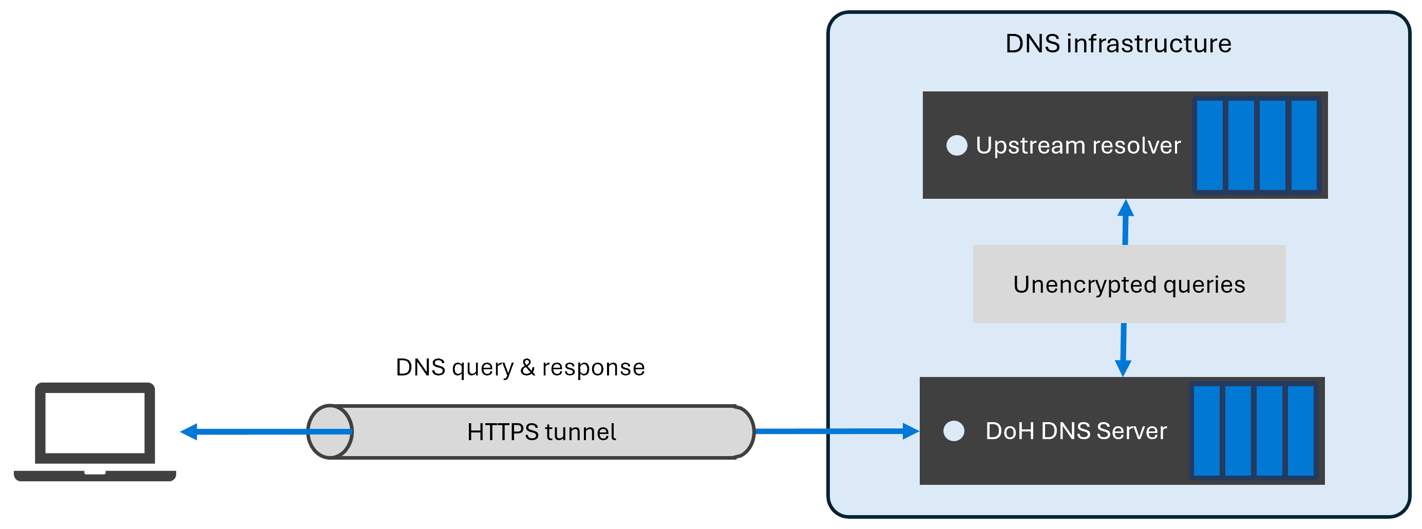 HTTPS 経由の DNS では、基本的な DNS クエリと応答モデルは変更されません。 代わりに、DNS メッセージをネットワーク経由で転送する方法が変更されます。 DNS サーバーで DoH を有効にすると、DoH は暗号化された追加の通信オプションになり、その機能を明示的に無効にしない限り、DNS サーバーは引き続き従来の DNS クエリに応答します。