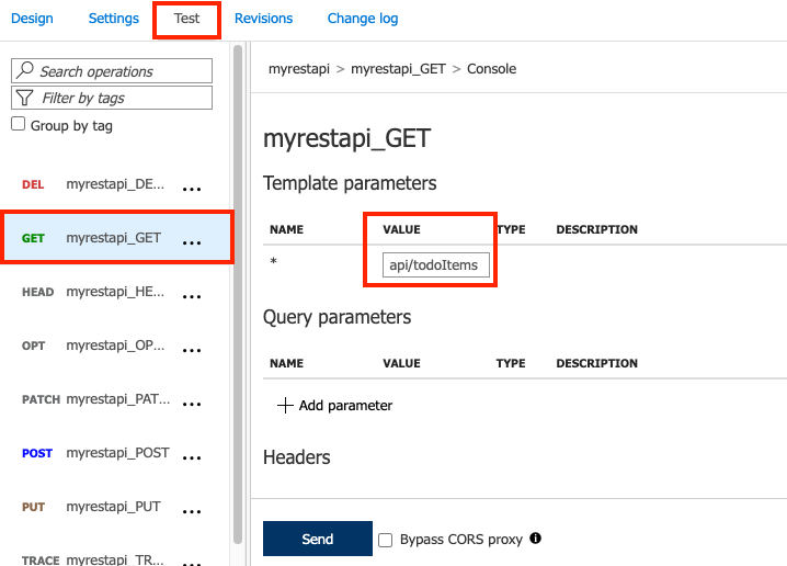 On the Test tab, under Template parameters, update the value next to the wildcard (*) name. For example, enter api/todoItems. This value gets appended to the path