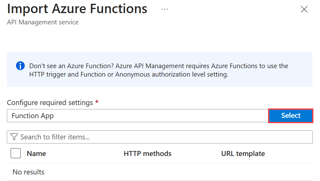 Select the functions that you want to import and click Select. You can only import functions that have an HTTP trigger and an Anonymous or Function authorization level.