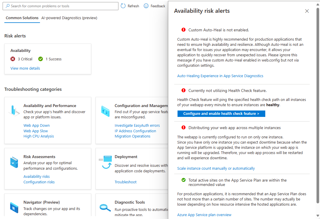 The App Service diagnostics page performs a series of configuration checks and offers recommendations based on your application's unique configuration.