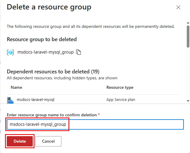 - In Resource Group, select msdocs-laravel-mysql_group.