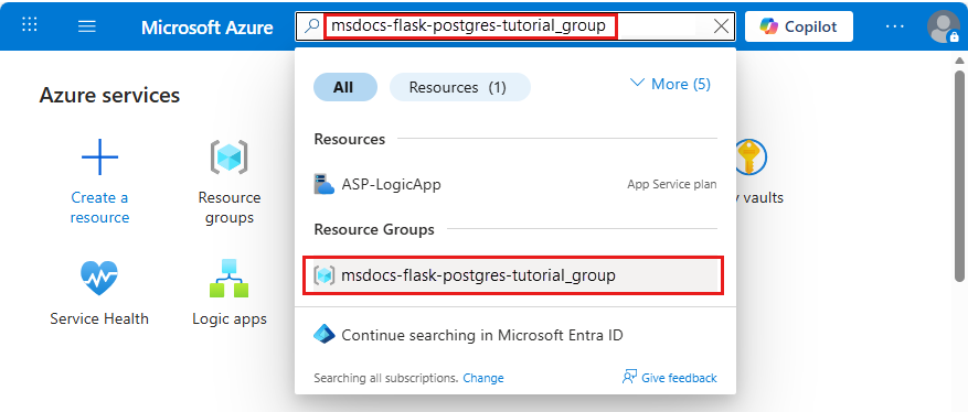 - In Resource Group, select msdocs-python-postgres-tutorial.