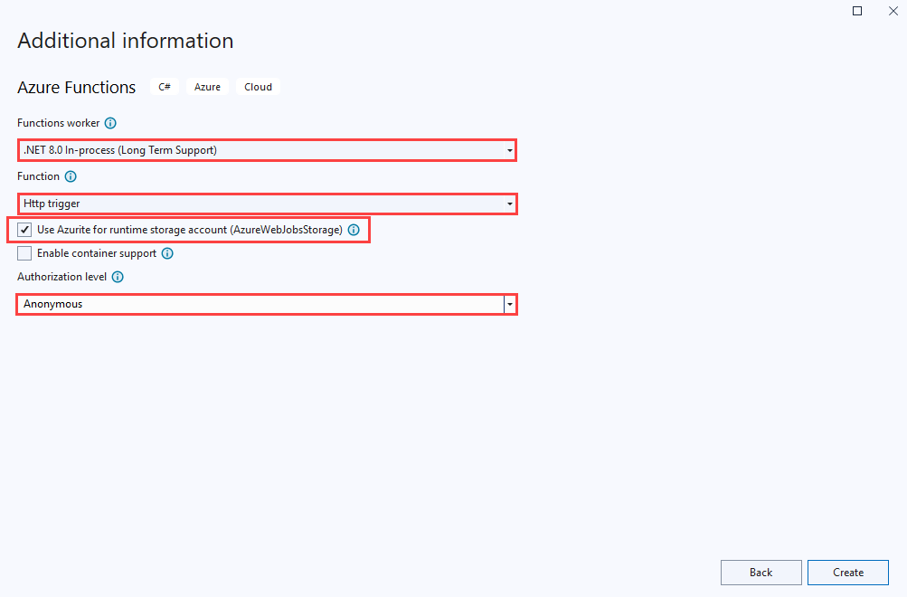 Setting Action Description Functions worker Select .NET 8.0 Isolated (Long Term Support). Visual Studio creates a function project that runs in an isolated worker process. The isolated worker process also supports other versions of .NET and .NET Framework that don't offer long term support (LTS). For more information, see Azure Functions runtime versions overview. Function Select Http trigger. Visual Studio creates a function triggered by an HTTP request. Use Azurite for runtime storage account (AzureWebJobsStorage) Select this checkbox. Because a function app in Azure requires a storage account, one is assigned or created when you publish your project to Azure. An HTTP trigger doesn't use a Storage account connection string. All other trigger types require a valid Storage account connection string. Authorization level Select Anonymous. When you use this authorization setting, any client can trigger the created function without providing a key. This configuration makes it easy to test your new function. For more information, see Authorization level. Setting Action Description Functions worker Select .NET 8.0 In-process (Long Term Support). Visual Studio creates a function project that runs in-process with version 4.x of the Functions runtime. For more information, see Azure Functions runtime versions overview. Function Select Http trigger. Visual Studio creates a function triggered by an HTTP request. Use Azurite for runtime storage account (AzureWebJobsStorage) Select this checkbox. Because a function app in Azure requires a storage account, one is assigned or created when you publish your project to Azure. An HTTP trigger doesn't use a Storage account connection string. All other trigger types require a valid Storage account connection string. Authorization level Select Anonymous When you use this authorization setting, any client can trigger the created function without providing a key. This configuration makes it easy to test your new function. For more information, see Authorization level. Make sure you set the Authorization level to Anonymous. If you select the default level of Function, you're required to present the function key in requests to access your function endpoint.