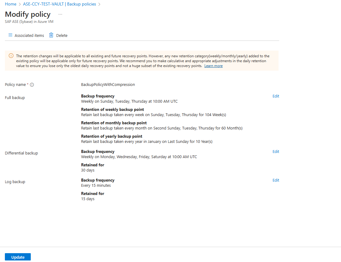 You can change the underlying policy for an SAP ASE backup items > View details > Backup policy > Change Backup Policy.