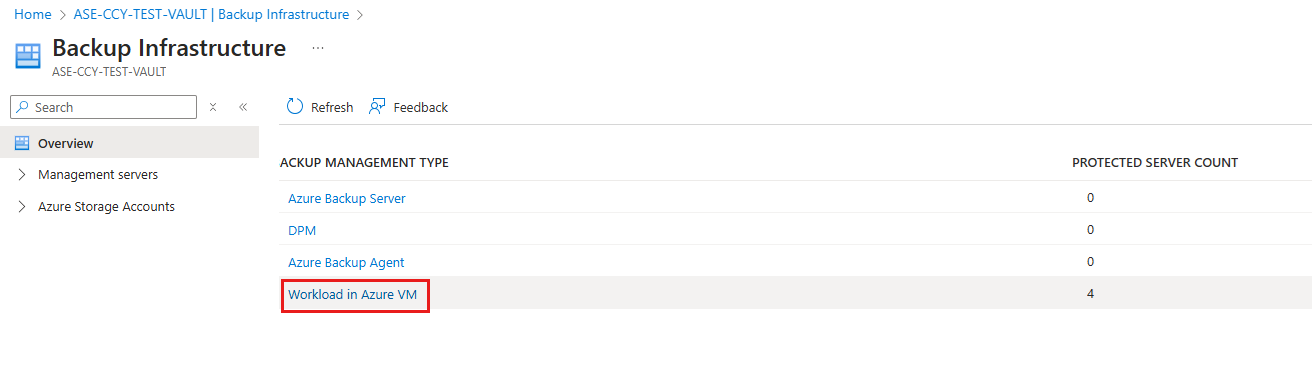 On the Backup Infrastructure pane, for BACKUP MANAGEMENT TYPE, select Workload in Azure VM.