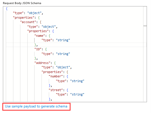 If you don't have a JSON schema, you can generate the schema from a sample payload by using the Use sample payload to generate schema capability.The following example shows a sample JSON schema: