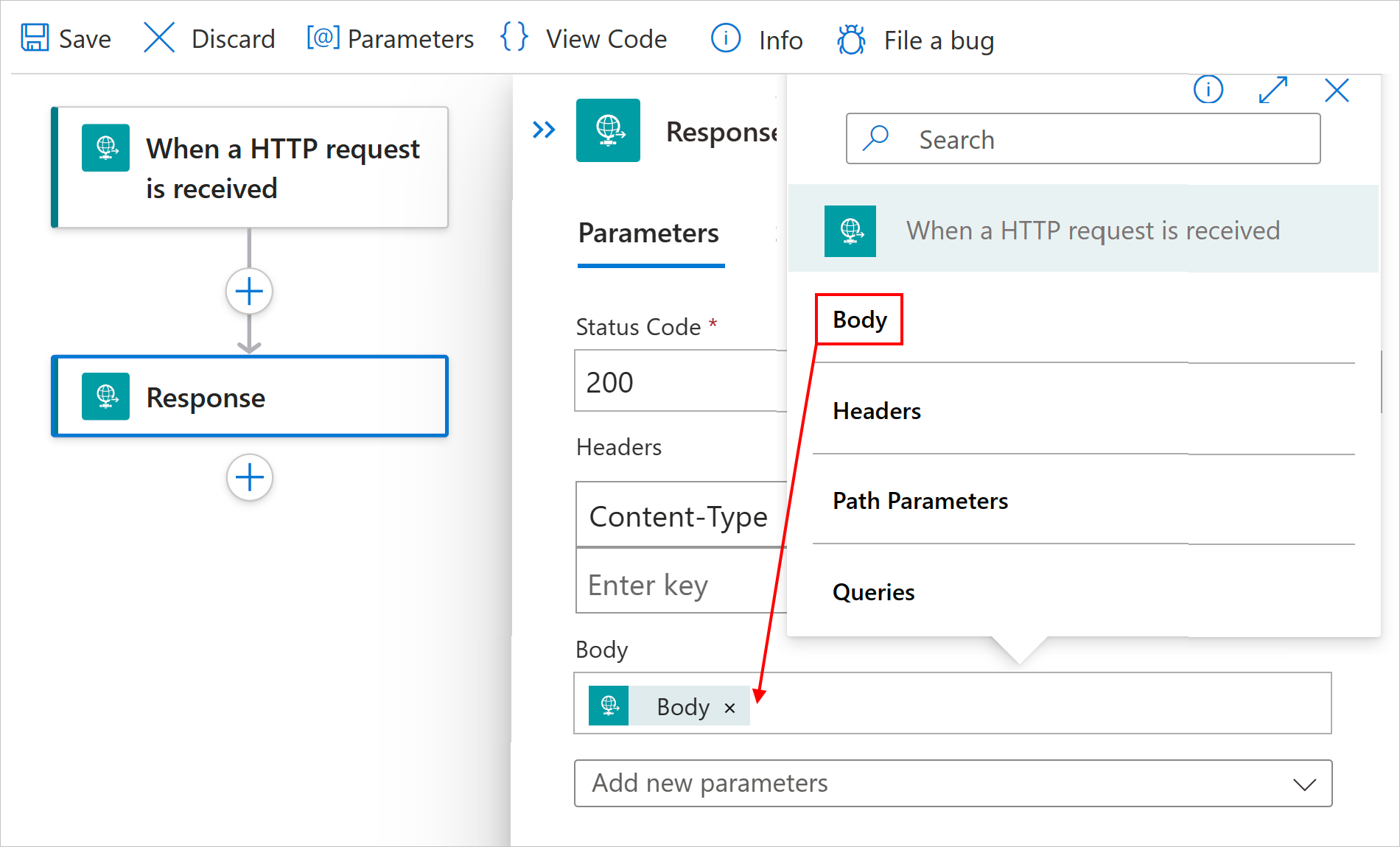 Property name JSON property name Required Description Status Code statusCodeYes The status code to return in the response Headers headersNo A JSON object that describes one or more headers to include in the response Body bodyNo The response body When you select inside any text fields, you get the options to open the dynamic content list (lightning icon) or the expression editor (function icon). When you choose the dynamic content list, you can select outputs that are available from earlier steps in the workflow. If you specified a schema in the Request trigger, the schema properties also appear in the dynamic content list and are available for you to use in your workflow.