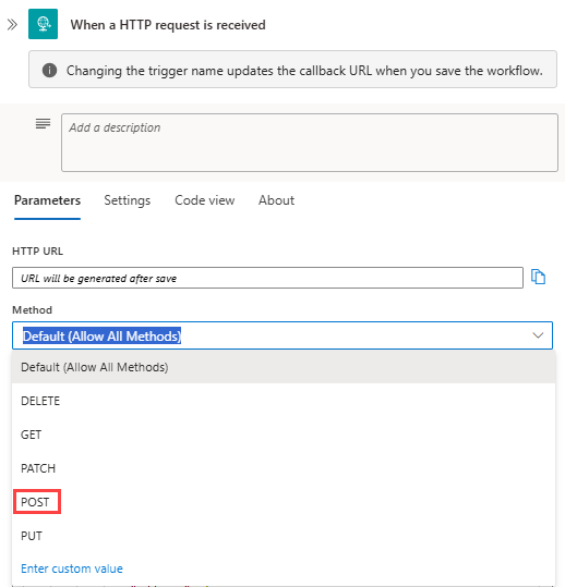 From the Method list, select the method that the trigger expects inbound requests to use.