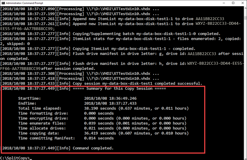 After the dataset is split and copied, the summary of the Split Copy tool for the copy session is presented as shown in the following sample output.