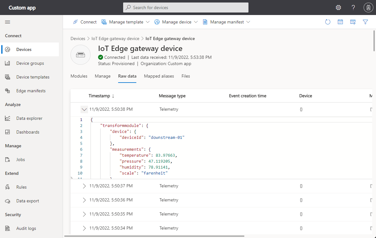 Verify: Send data from a downstream device to the gateway and verify the transformed device data reaches your IoT Central application.