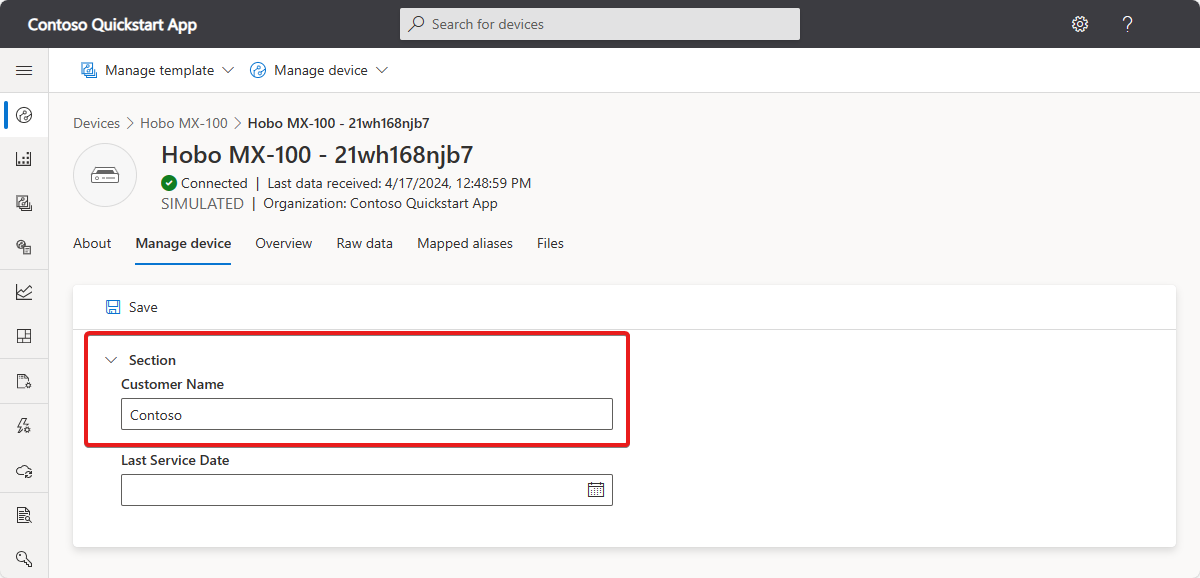 For four of the simulated sensor devices, use the Manage device view to set the customer name to Contoso and select Save.