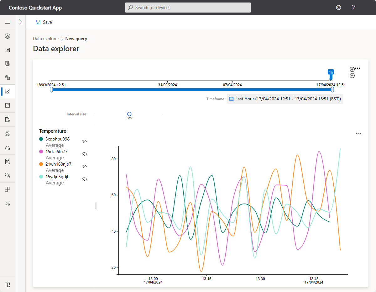You can use Data explorer with a device group to analyze the telemetry from the devices in the group. For example, you can plot the average temperature reported by all the Contoso environmental sensors.