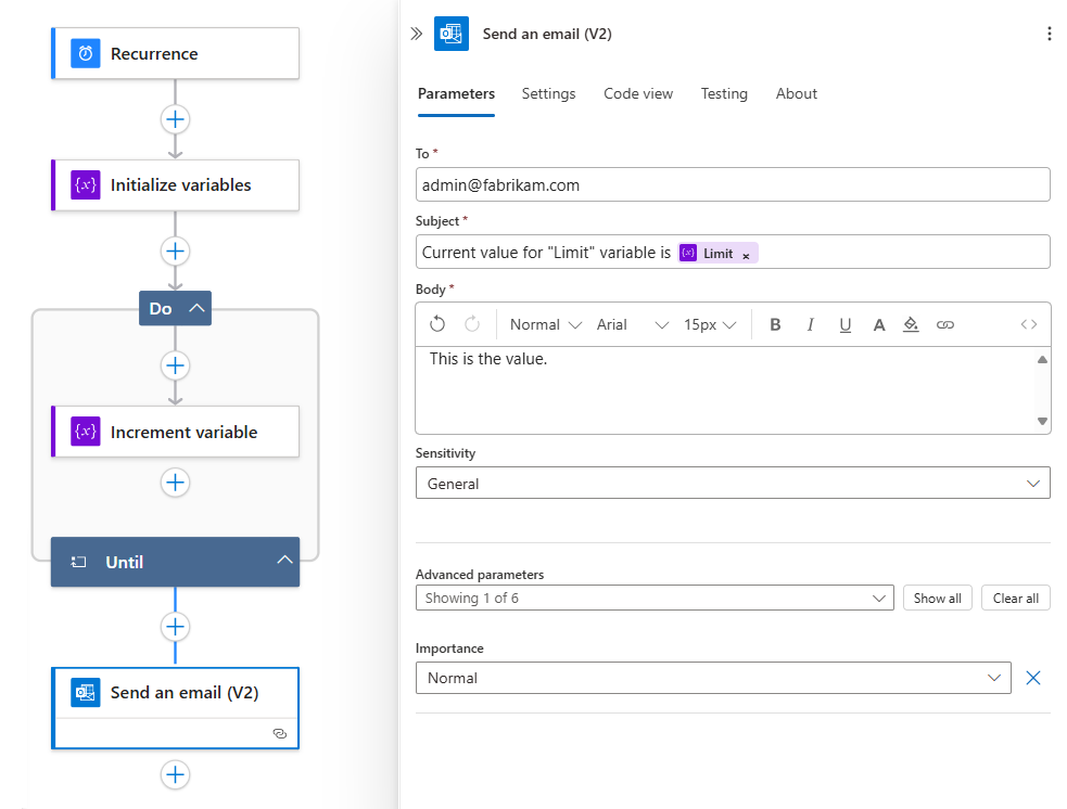 Parameter Value Limit Select the Limit variable. Value 1 Outside and under the Until action, follow these general steps to add an action that sends email in your Consumption or Standard logic app workflow.