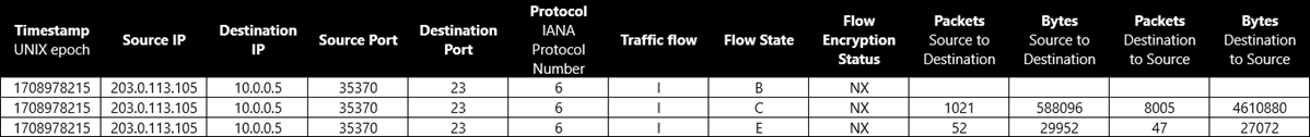 Here's an example bandwidth calculation for flow tuples from a TCP conversation between 203.0.113.105:35370 and 10.0.0.5:23: