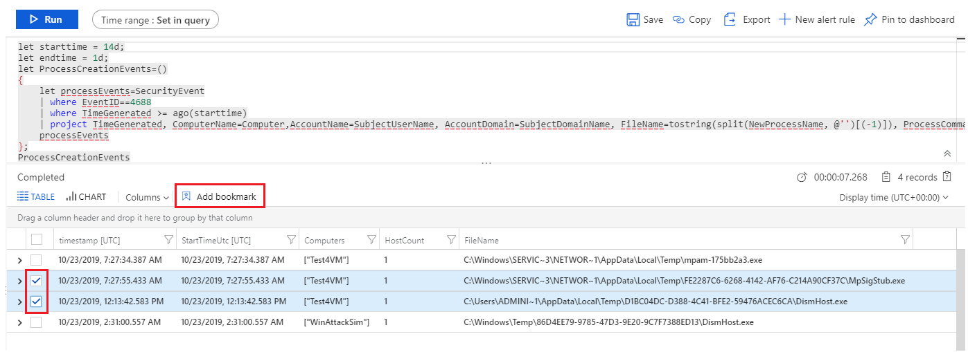 From the command bar on the Hunting > Bookmarks tab, select Bookmark Logs to view the raw bookmark data for all bookmarks.