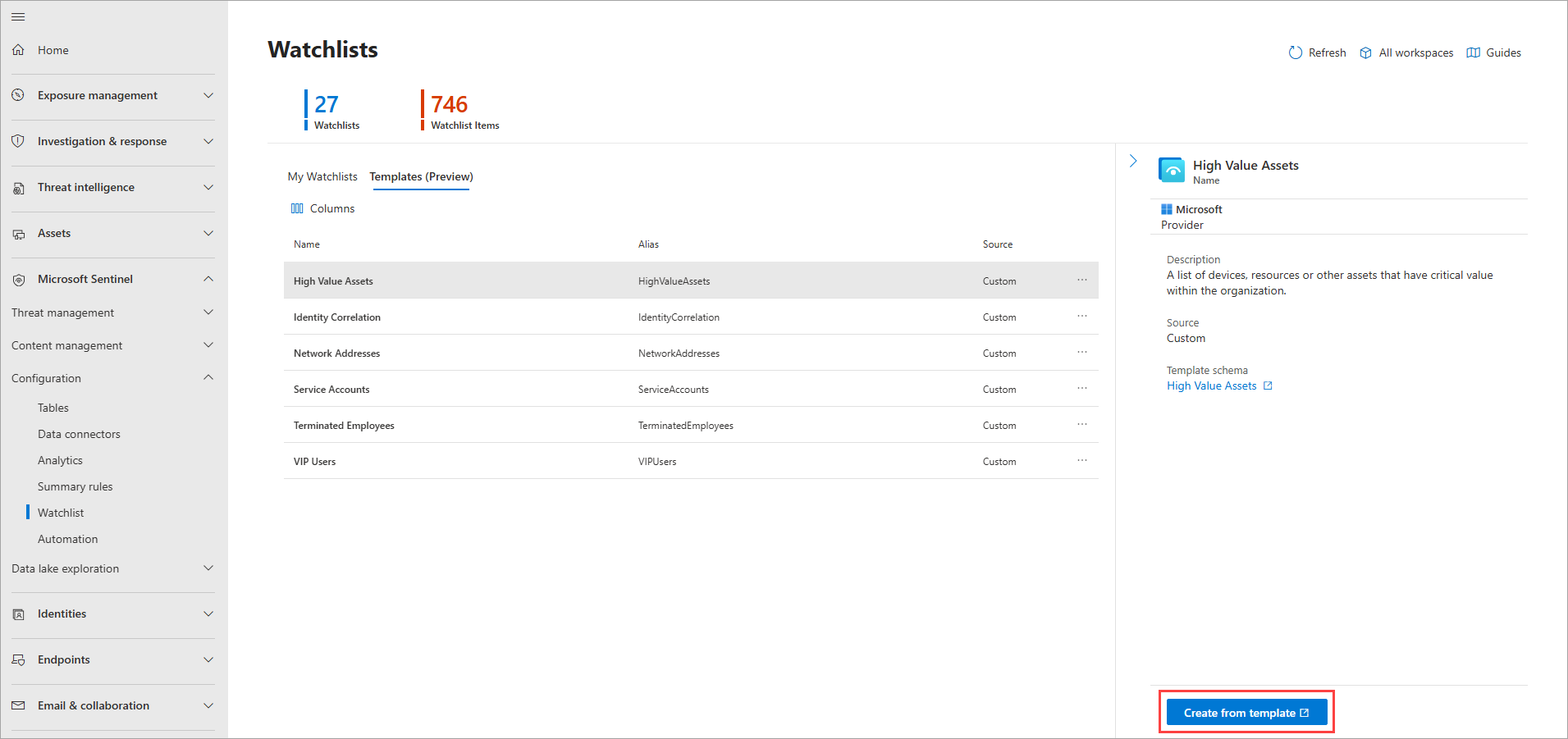 - For a watchlist file created from a template downloaded from Microsoft Sentinel: Go to the watchlist Templates (Preview) tab. Select the option Create from template. Azure pre-populates the name, description, and watchlist alias for you.