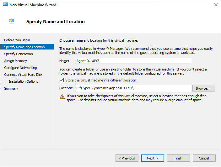 Within the Specify Name and Location pane, provide values for the agent VM's Name and Location fields. The location should match the folder where the VHD is stored, if possible. Select Next.