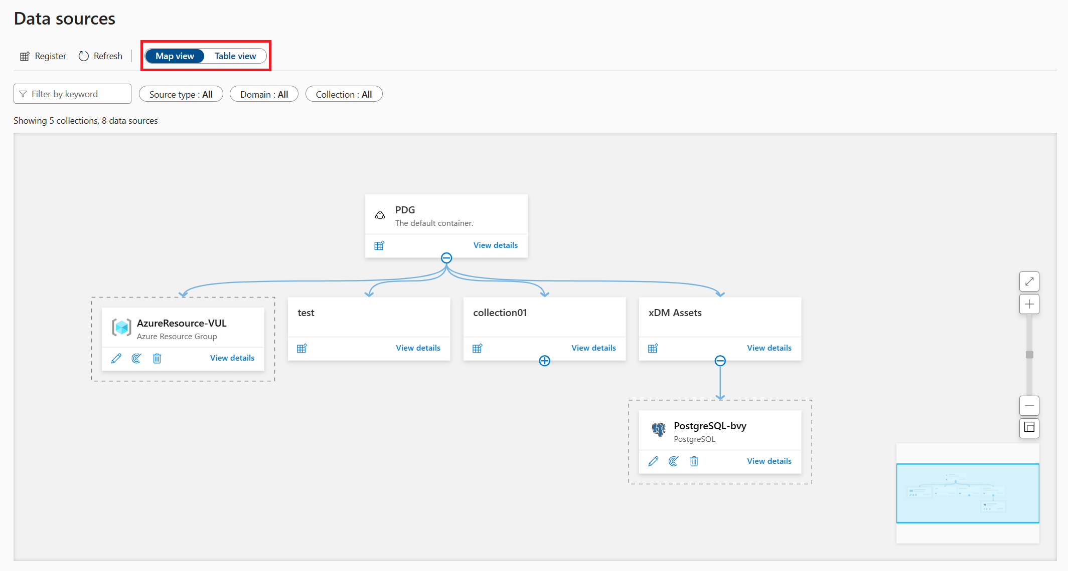 In Map view, you see all of your sources and collections, and you can filter by sources, domains, and collections. In the following screenshot, you see the default domain at the top called PDG. It has three collections: test, collection01, and xDM Assets. The collection xDM Assets has a PostgreSQL source registered to it. An Azure resource group source is also housed under the root domain.