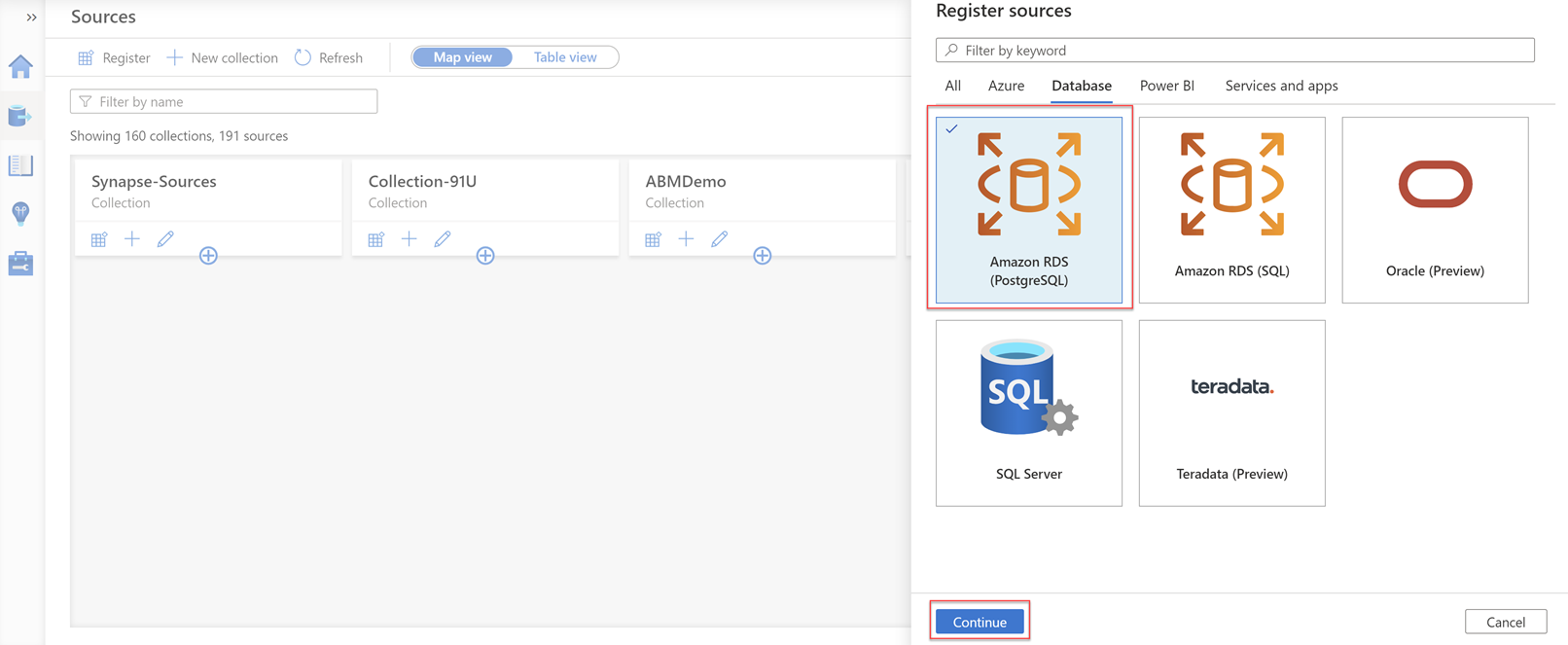 .On the Sources page, select Register. On the Register sources page that appears on the right, select the Database tab, and then select Amazon RDS (PostgreSQL) or Amazon RDS (SQL).
