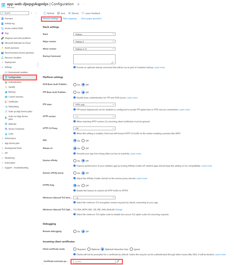 The following screenshot shows how to set a certificate exclusion path. In this example, any path for the app that starts with /public doesn't request a client certificate. Path matching isn't case specific.